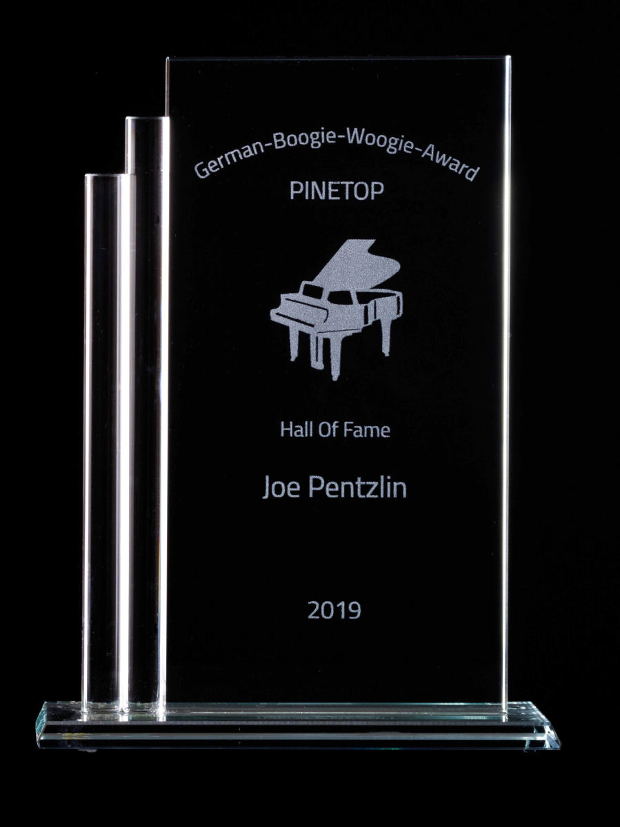 Aber die Frage meines Musikstücks kann ich heute ENDLICH mit einem glücklichen „JA!“ beantworten: Das Stück heißt nämlich: „Has anyone seen Joe Pentzlin?“ Ja, denn da vorne ist er! Und wir bitten ihn nach vorne! Herzlichen Glückwunsch zur Aufnahme in die Pinetop - HALL OF FAME: JOE PENTZLIN!